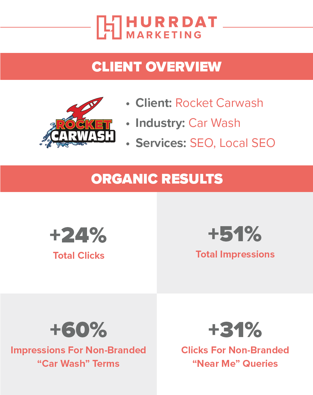 Rocket Carwash reached out to Hurrdat wanting more customers to visit their car washes and sign up for memberships. People are very aware of Rocket Carwash as a brand, but their website lacked the optimization for them to rank for non-branded queries like “car wash near me” that drive new customers to their locations.